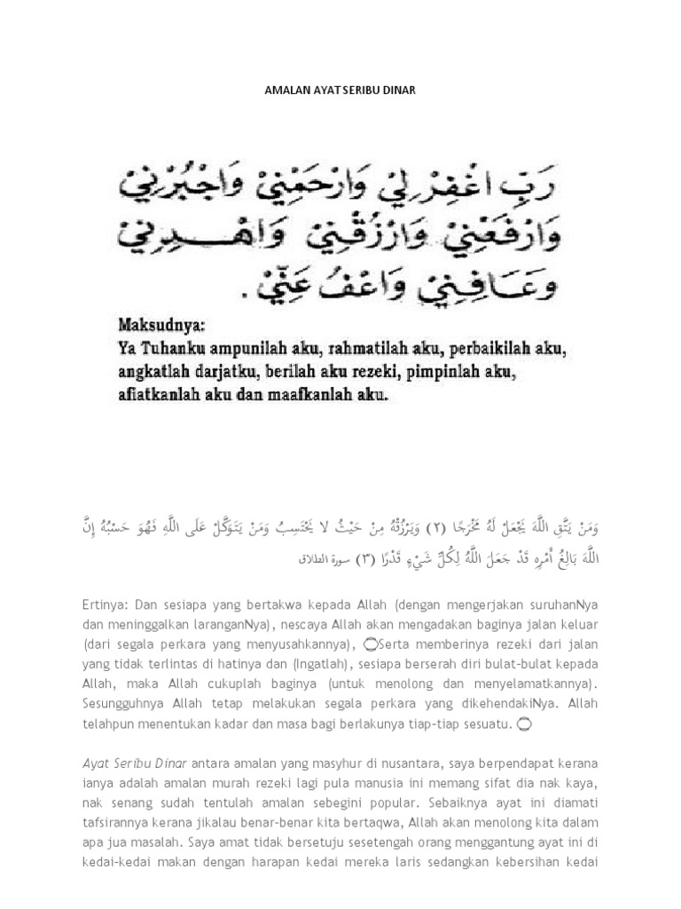 Serta memberikannya rizki dari jalan. Apabila anda memahami rahasia amalan seribu dinar, maka anda akan mengalami banyak keajaiban dalam hal rezeki dan kekayaan. Dinamakan ayat seribu dinar adalah karena khasiat ayat seribu dinar yang konon jika dibaca bunyi ayat seribu dinar adalah: Khasiat dari doa seribu dinar juga diperkuat oleh hadits nabi muhammad saw, yang telah diriwayatkan di kitab al musnad. Ayat seribu dinar mp3 song by imam muda hassan adli from the album o.k.b.