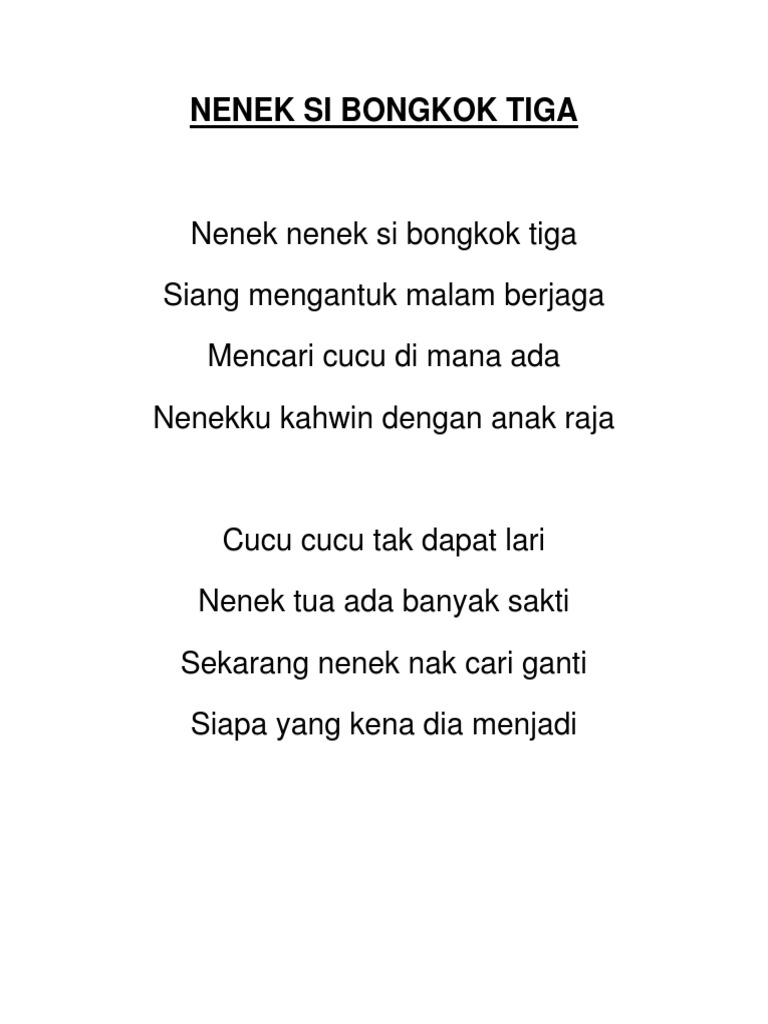 Nenek nenek si bongkok tiga. Download lagu nenek si bongkok tiga mp3 dapat kamu download secara gratis di metrolagu. Cerita bermula dengan mei mei, susanti dan devi bermain di padang sambil menyanyi lagu nenek nenek si bongkok tiga. Nenek nenek si bongkok tiga. Siang malam asyik berjaga mencari cucu di mana ada nenekku kahwin dengan anak raja.