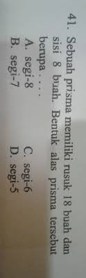 Suatu Prisma Memiliki 24 Rusuk Dan 10 Sisi Bentuk Alas Prisma Tersebut Adalah Segi Brainly Co Id from id-static.z-dn.net Banyaknya titik sudut pada prisma adalah 2n. Prisma adalah bangun ruang tiga dimensi yang dibatasi oleh alas dan tutup identik berbentuk segi n dan sisi sisi tegak berbentuk segiempat. Bentuk alas dan atap prisma bersifat kongruen. Prisma segitiga adalah jenis prisma yang memiliki bentuk alas dan penutup berbentuk segitiga, serta memiliki selimut berbentuk persegi panjang. Dengan kata lain prisma adalah bangun ruang yang mempunyai penampang melintang yang selalu sama dalam bentuk dan ukuran. Penamaan prisma tersebut berdasarkan bentuk alas dan tutupnya. Jenis prisma ada beberapa macam yang diberi nama sesuai bentuk. Jumlah sisi prisma adalah n+2, misalnya:
