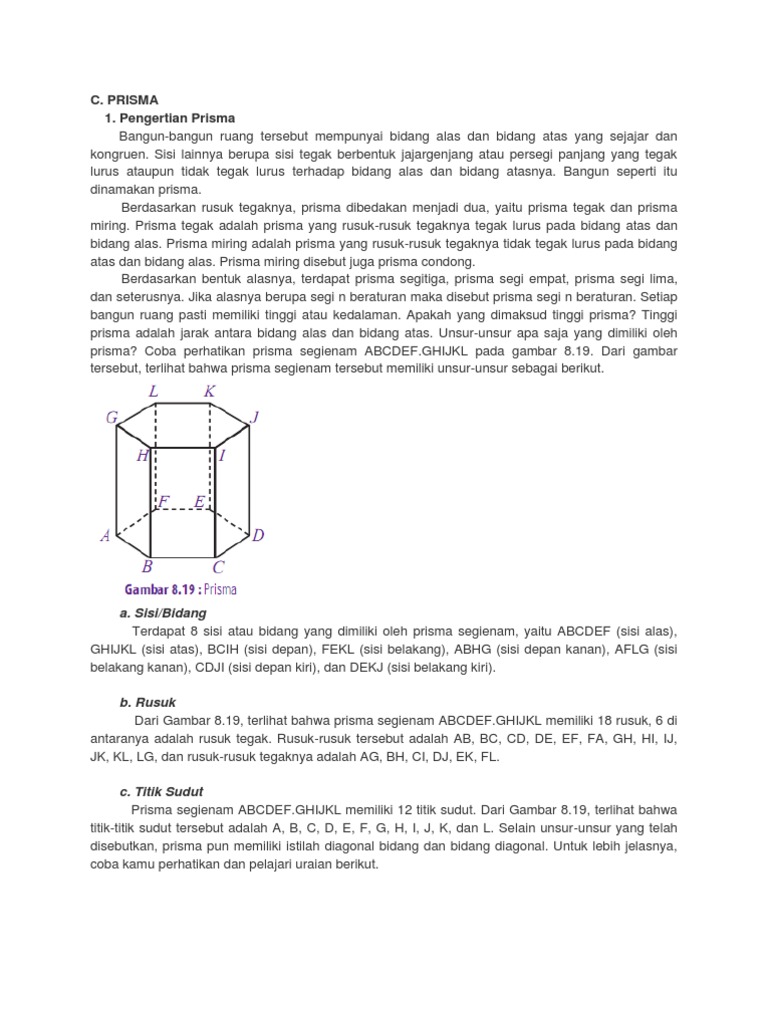 Alas nya = 8 cm dan 6 cm Jadi prisma adalah bangun ruang yang memiliki sepasang bidang sejajar dan kongruen yang merupakan alas dan tutup. Memiliki 10 buah titik sudut. Jumlah sisi prisma adalah n+2, misalnya: Prisma segitiga adalah prisma yang mempunyai alas segi tiga, apapun jenis segitiganya;
