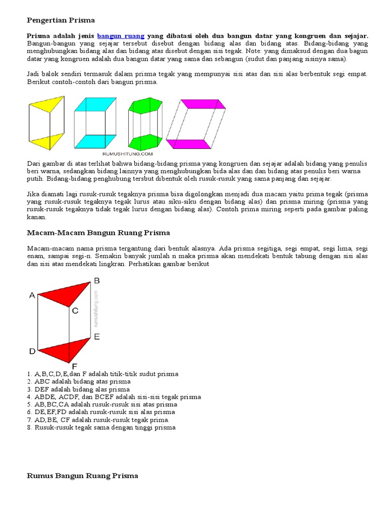 Sisi atap dan sisi alas prisma bersifat kongruen berarti kedua sisi tersebut mempunyai ukuran dan bentuk yang sama. Pada gambar terlihat bahwa segitiga abc dan def memiliki ukuran dan bentuk yang sama. Dengan kata lain prisma adalah bangun ruang yang mempunyai penampang melintang yang selalu sama dalam bentuk dan ukuran. Bentuk alas dan atap prisma bersifat kongruen. Definisi prisma yang lain adalah prisma bidang banyak yang dibatasi oleh dua buah sejajar dan beberapa buah… Prisma segitiga, prisma segi empat, prisma segi lima, dan lain sebagainya. 2 sisi yaitu sisi alas dan sisi tutup serta n sisi tegak. Prisma memiliki n + 2 sisi. Memiliki lima sisi,yaitu 3 sisi samping berbentuk persegi panjang dan 2 sisi alas dan atap berbentuk segitiga. Dengan kata lain prisma adalah bangun ruang yang mempunyai penampang melintang yang selalu sama dalam bentuk dan ukuran. Jumlah sisi pada setiap bentuk prisma adalah n+2, misalnya : Prisma memiliki bentuk alas dan atap yang kongruen. · bidang alas dan bidang atas prisma sejajar dan kongruen.